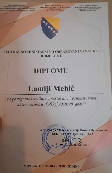 Nagrađeni najbolji učenici osnovnih i srednjih škola u Federaciji BiH – Mehić Lamija