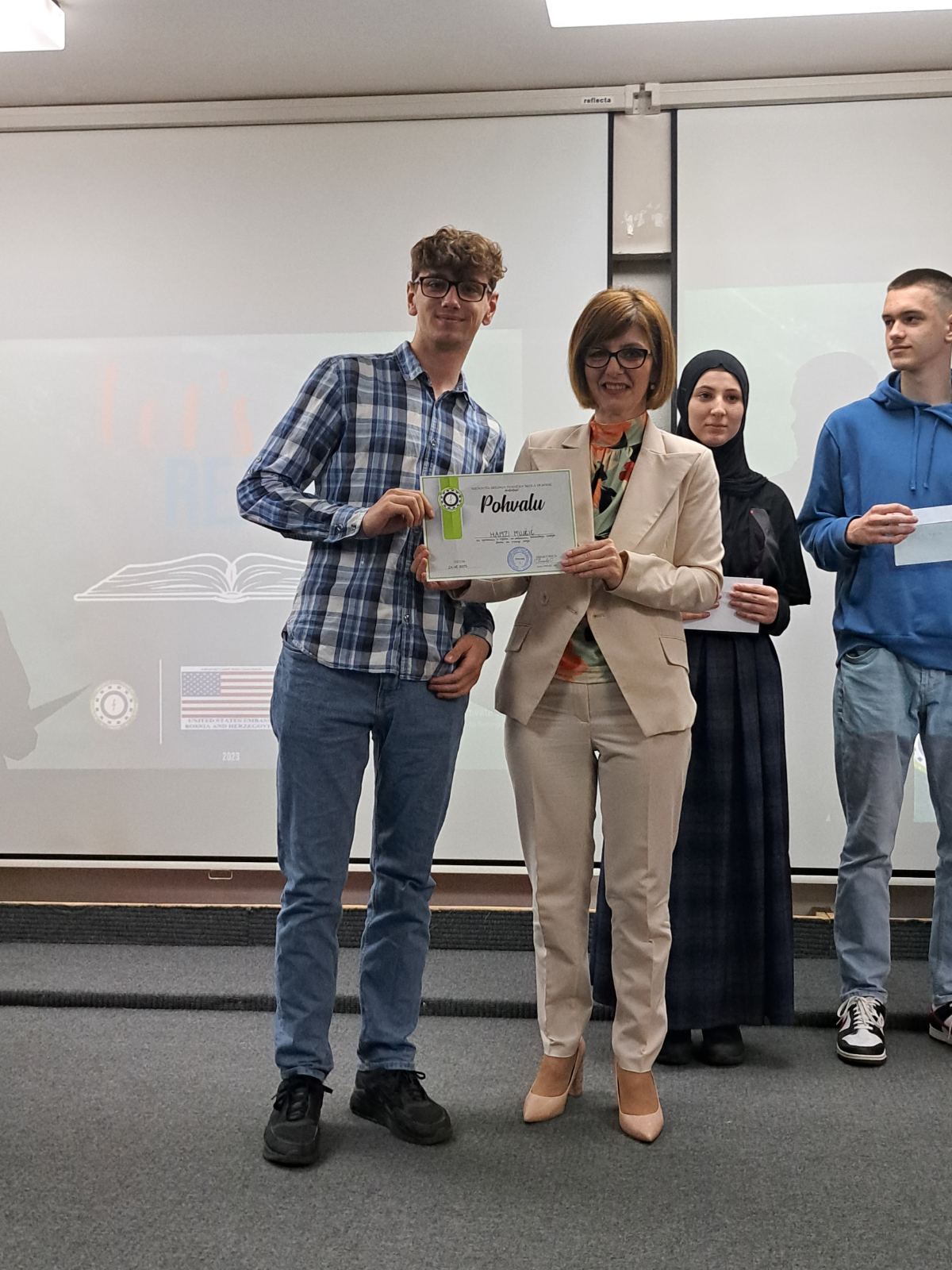 Direktorica MSTŠ Travnik uručila je pohvalu učeniku MSTŠ Travnik Hamzi Mujčić za ostvareno 4. mjesto na državnom takmičenju u pisanju eseja u sklopu Let’ s read projekta na kojem je učestvovalo 400 učenika i sam rezultat našeg učenika je izuzetan u takvoj konkurenciji, te je učenik dobio certifikat od organizatora i novčanu nagradu.